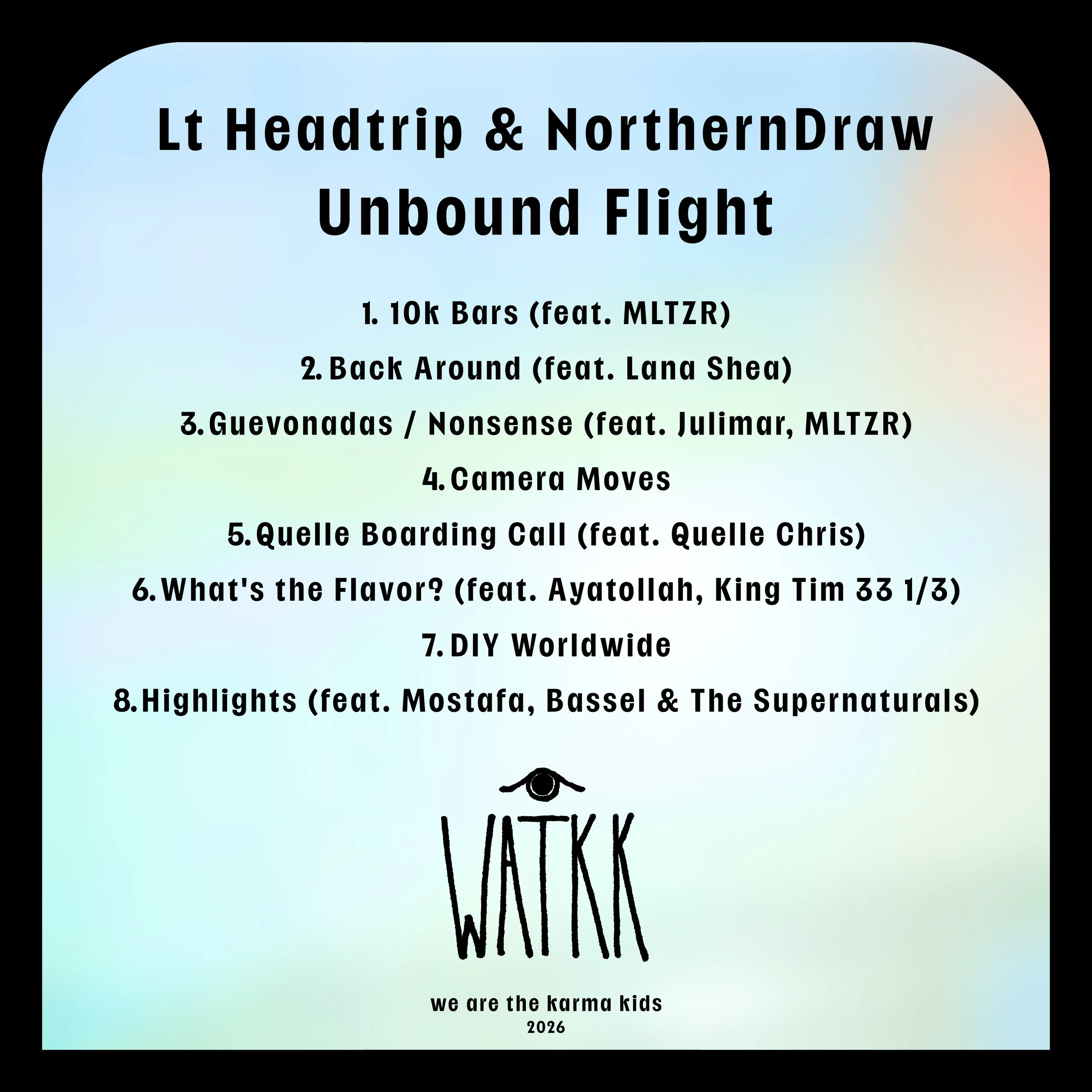 We take off with the hype album opener, 10k Bars, supercharged with international radio DJ shoutouts, then dive directly into the ruminant yet energetic 'Back Around' featuring PDX vocalist Lana Shea. Ayatollah, Queens legend, teams up with Trip to offer cinematic glances into the culture of NYC neighborhoods over a classic East Coast beat co-produced by PDX vinyl wizard King Tim 33⅓. From Venezuelan rapper Julimar’s rapid-fire battle bars in Spanish, a slew of multilingual shout outs collected in the pair’s travels, and the Arabic-peppered vocal performances in groovy album closer Highlights, Unbound Flight is ripe with diverse voices. Bassel Almadani, Syrian-American activist and frontman of the funk/soul ensemble Bassel & The Supernaturals, joins Egyptian rapper Mostafa for a reflective, groovy final stop on the quick but dense journey. Loosen your safety belts, lean your seats way back, and enjoy the ride on Unbound Flight. Available everywhere March 20th via we are the karma kids.